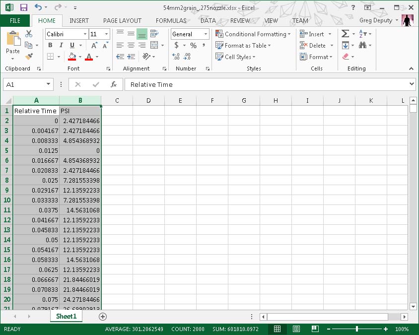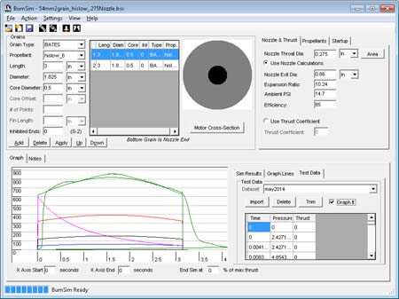 ![]() Once you have data in a spreadsheet, select/highlight the time and pressure columns (As in the screenshot above) and copy it to your clipboard. You can click control-C to copy to clipboard once the data is selected. Next, if you havent already, open BurnSim and load the file for the motor you have tested. Click on the 'Test Data' tab in the middle-right area of the screen, and click the 'Import' Button. This will take the data you copied to the clipboard and import it into the currently loaded motor file. Once this is done, the data will be graphed along with your simulation, and will be saved with the motor file. You will be prompted to name the data set you are importing. Once complete, you will see the pressure data graphed along with the sim data. ![]() Hosted by The BlastZone |